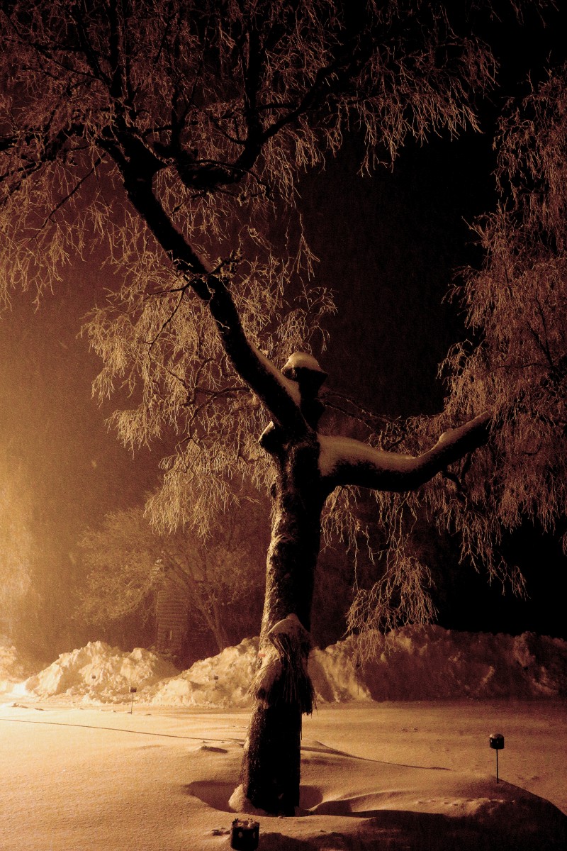 Conifer, lamplight, hillside, snow 23 1 15
