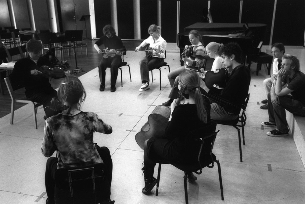 Opening the composers workshop. Carl Nielsen Conservatory, Odense, 2004 (composers Rasmus Zwicki and Lars Bagger at right) Photo Richard Bram