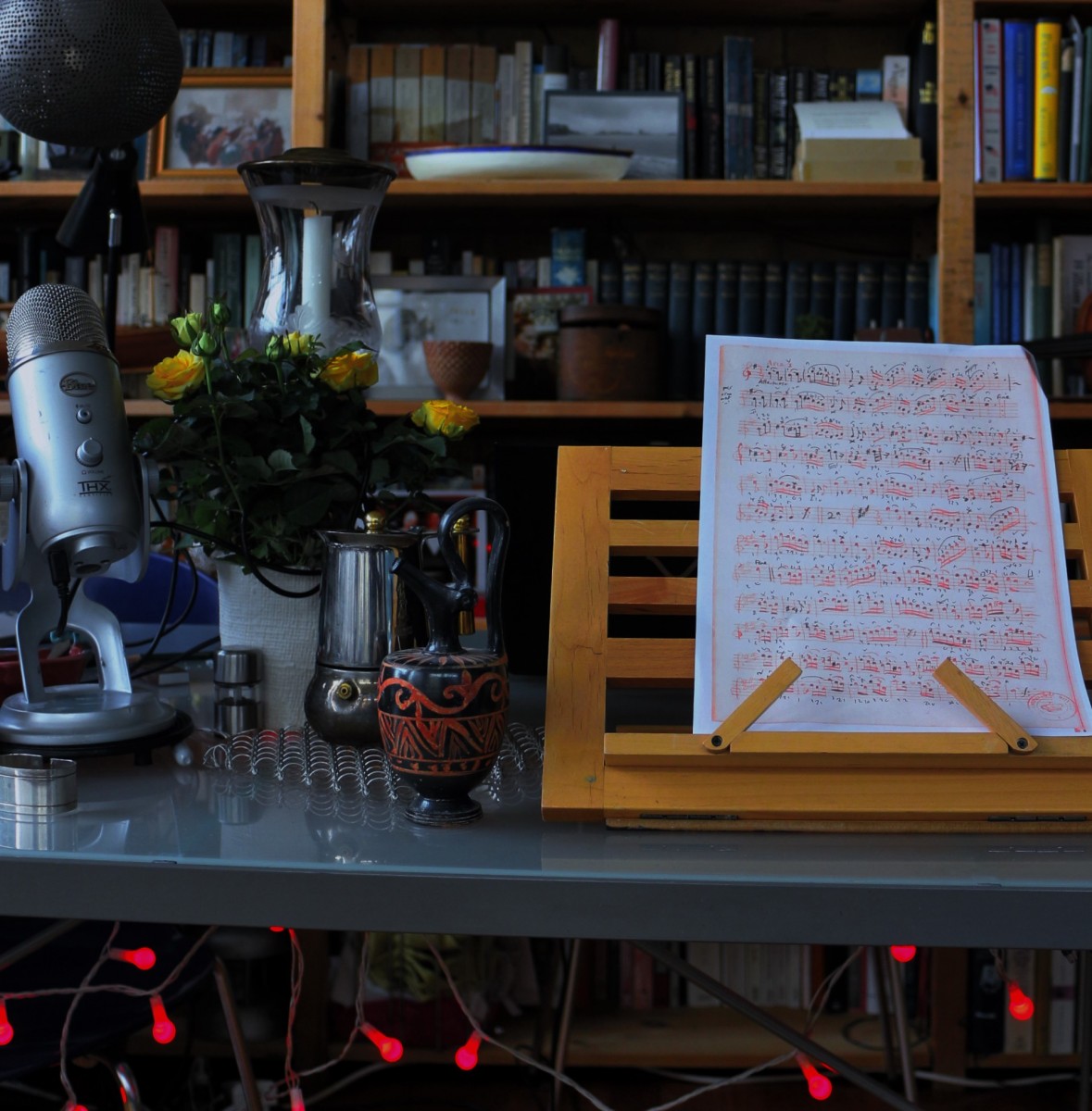 Beginning the day. Coffee, something ancient, roses, and beautiful bit of anonymous 18th Century fiddle music 25 2 16