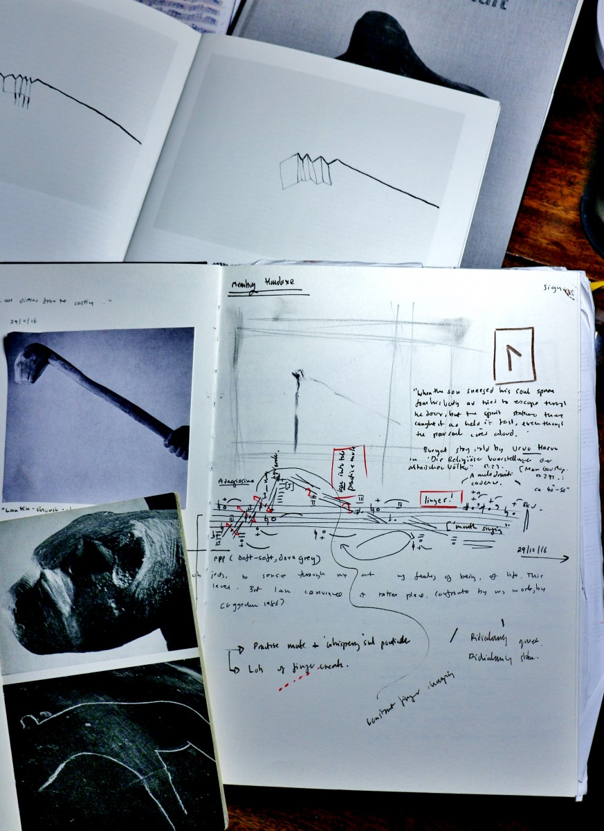 The conversation went back and forth, from Groth’s materials to mine, from his drawings, to my violin, to his tapestries to my notebook, exploring questions of scale from small clay maquettes to 2 metre bronzes, to tiny gestures on the violin (he loves the sound of a gentle ricochet on the wood of the violin).