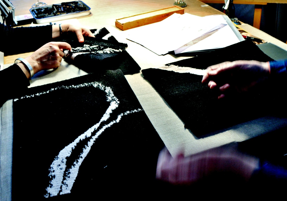 Discussing tapestry and the fine points of weaving. Jan Groth and Malene Skaerved 27 2 17