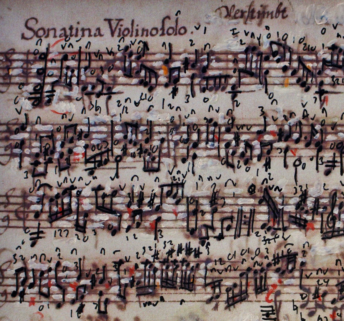 The beginning of the ‘Sonatina’. Note the instruction ‘Verstimmt’ -‘detuned’ or Scordatura. I have used white pencil to cover up the ‘bleed-though’ and acid damage from the ink. 23 3 17