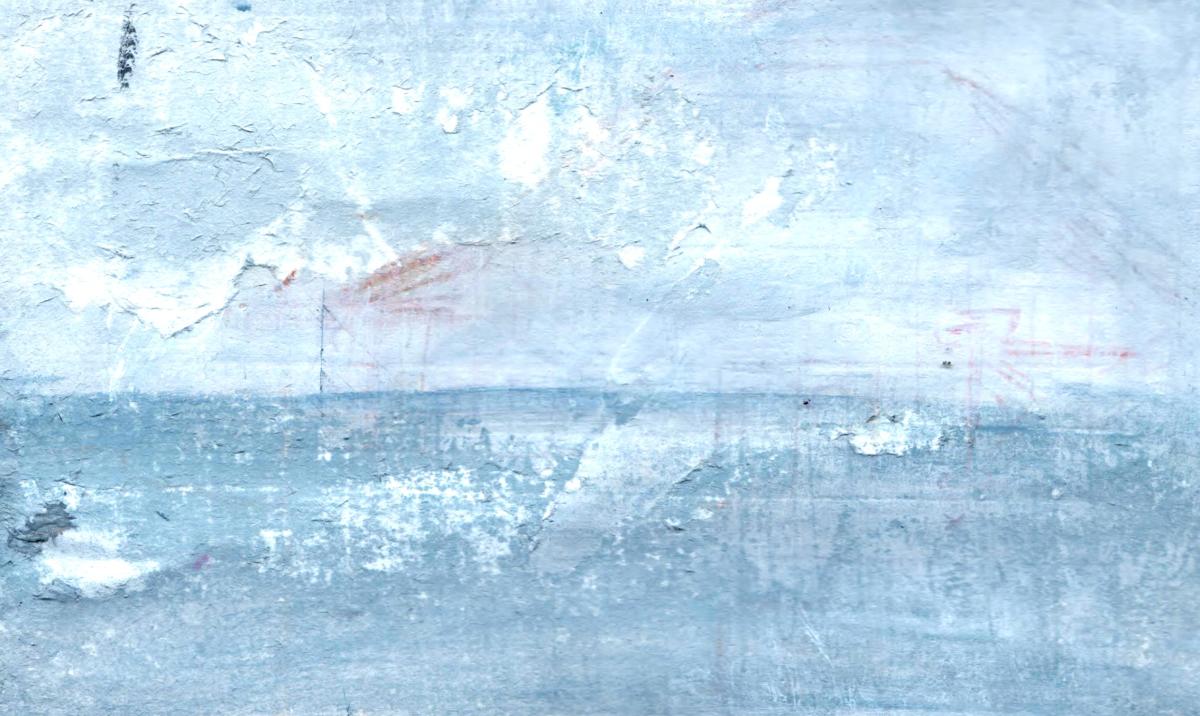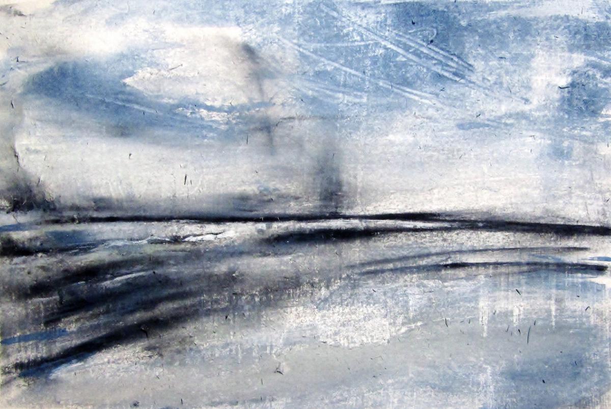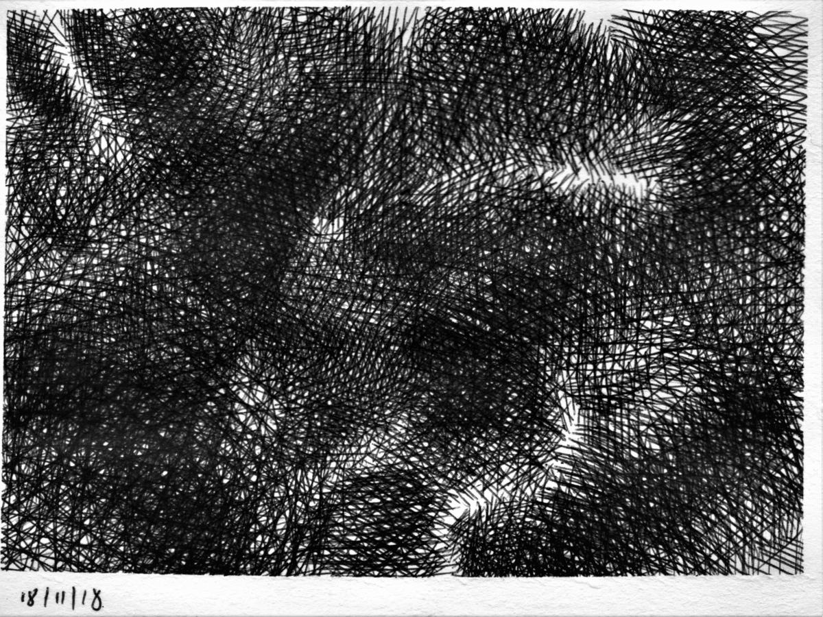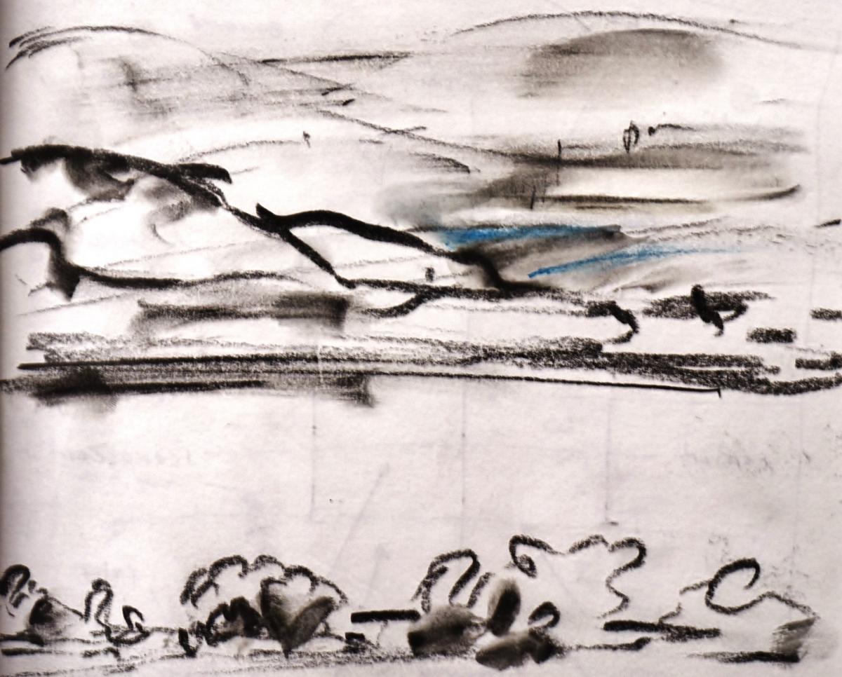330pm. NNE from Herne Bay. Ship starting engines, hull down. Contrails for Peter Lanyon. A word about painting/drawing and walking. Whilst I carry a sketch book when I walk, the majority of notes that I take are in incomprehensible shorthand. The images that strike me have nothing to do with the photographs that I take. As I walked down the cliff to the front at Herne Bay, the light was darkening from by left (the South), whilst the sky to the north was still light. For about 15 minutes, the horizon the the north was smudged with a filthy stack of smoke, which seem to be from a vessel hull down (more than 7/8 miles away, seen from sea level). The image crystallized this evening, and the ever-present jet trails over the Thames estuary nudged me towards Peter Lanyon’s work. A hero of mine. 27 10 18
