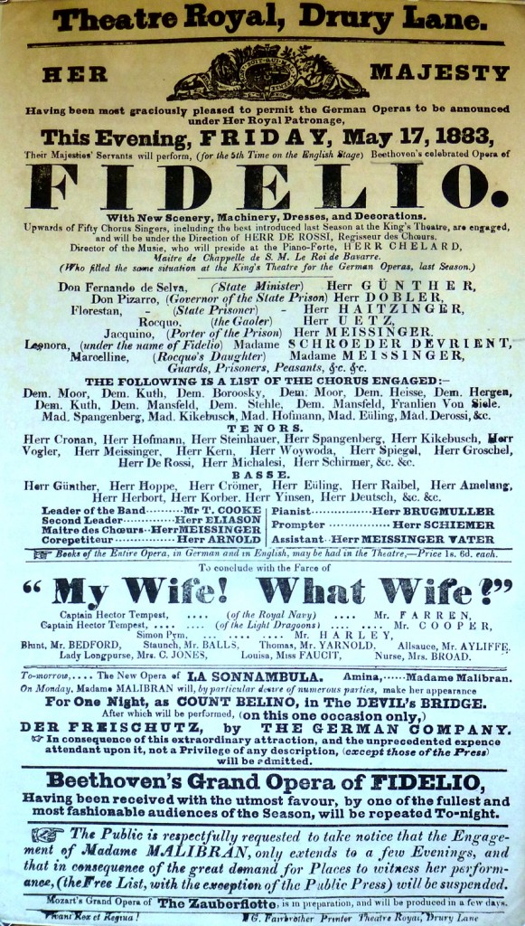 Found in the collection of the Blair School of Music, Nashville TN, a poster from the Kings Theatre, from May 1833, which brings together so many of extraordinary figures around Paganini’s peformances at the sames theatre, directed by Edward Eliasson, listed as second leader of the band, after Cooke (RAM Professor), who had directed many of his other concerts in London.